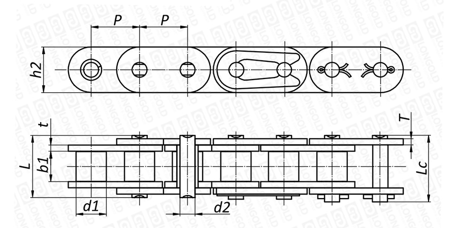 上圖為單排不銹鋼短節(jié)距B系列直板滾子鏈本體的結(jié)構(gòu)圖。