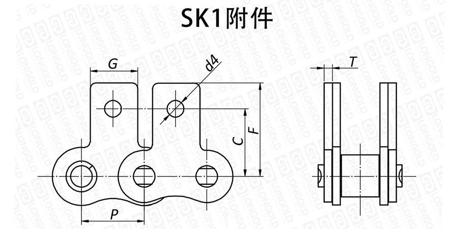 鏈條兩側鏈板向上延伸,延伸的附板成為附件,附板上帶1個螺孔,附件表示為:SK1。