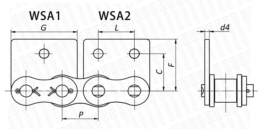 上圖為不銹鋼滾子鏈帶WSA1和WSA2附件的結(jié)構(gòu)圖。