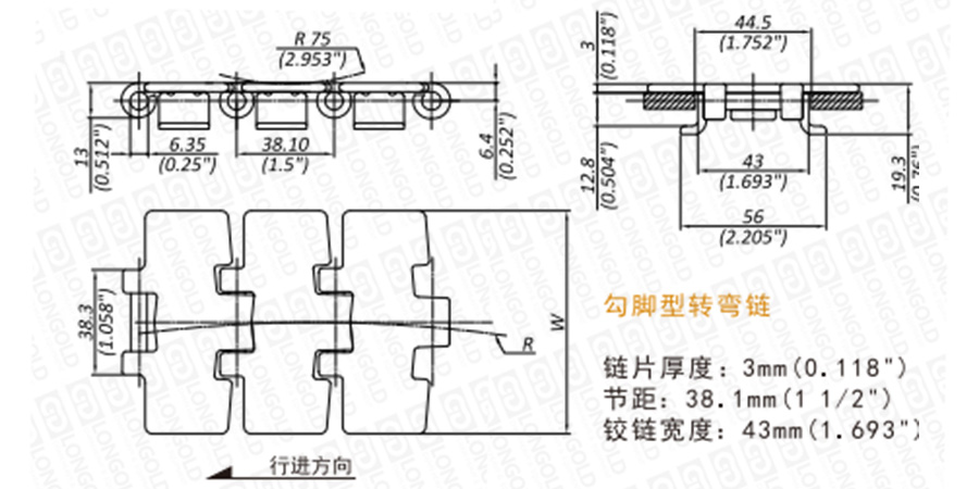 上圖為L(zhǎng)D981T系列側(cè)彎鏈的結(jié)構(gòu)圖,圖紙已標(biāo)明本體尺寸。