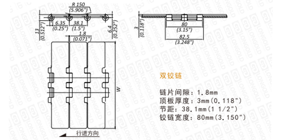 為雙鉸鏈條,鉸鏈寬度為80毫米。當(dāng)鏈片材質(zhì)為碳鋼時(shí),銷軸材質(zhì)為表面硬化鋼;當(dāng)鏈片材質(zhì)為不銹鋼時(shí),銷軸材質(zhì)也選用不銹鋼。