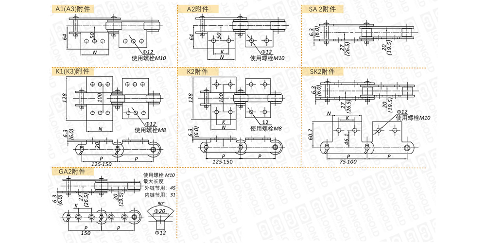 附件是為了將夾具安裝在鏈條上的零部件。可根據(jù)客戶要求設定安裝間隔。
