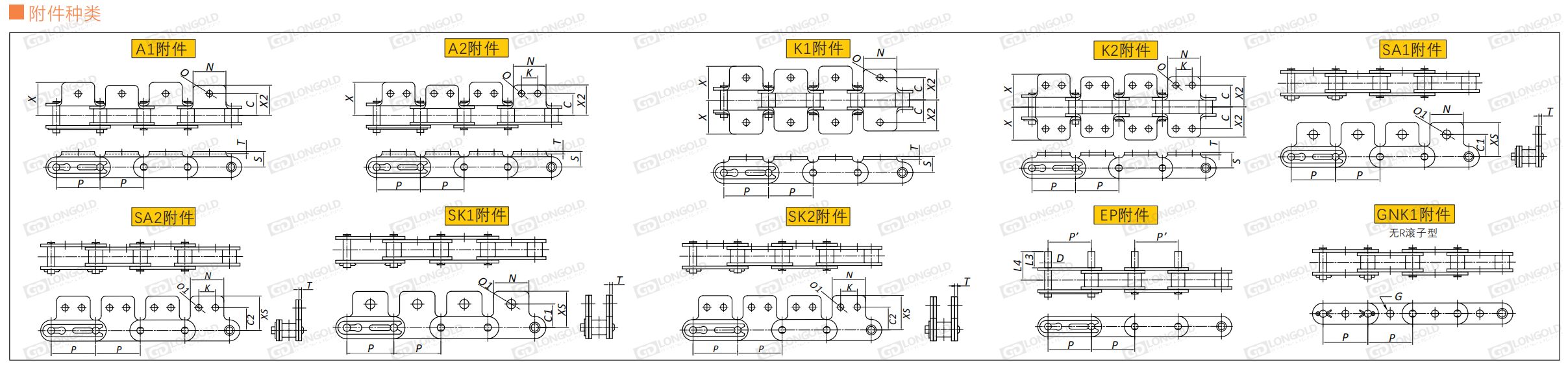 與短節(jié)距A系列滾?鏈條相?,鏈條節(jié)距增加1倍(稱為雙倍節(jié)距),鏈板形狀為直板形,帶附件的輸送?鏈條。依照ISO1275的A系列、ASME B29.100、JIS B1803規(guī)格。