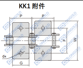 KK1附件,鏈條雙側(cè)各帶2個(gè)折彎板,且附板上帶單孔的附件。