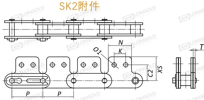 SK2附件,鏈條的兩側(cè)鏈板延伸,且附板上帶兩個(gè)孔的附件形式。
