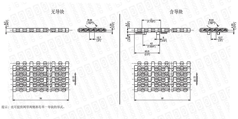 上圖為1/2"節(jié)距網(wǎng)帶與鏈板 500系列的結(jié)構(gòu)圖,圖紙中已標(biāo)明部分尺寸。