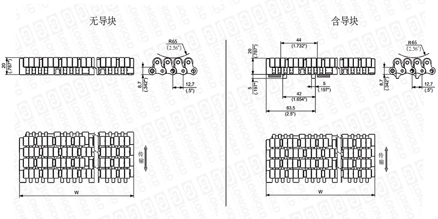 上圖為1/2"節(jié)距網(wǎng)帶與鏈板 LBP 610系列的結(jié)構(gòu)圖,圖紙中已標明部分尺寸。