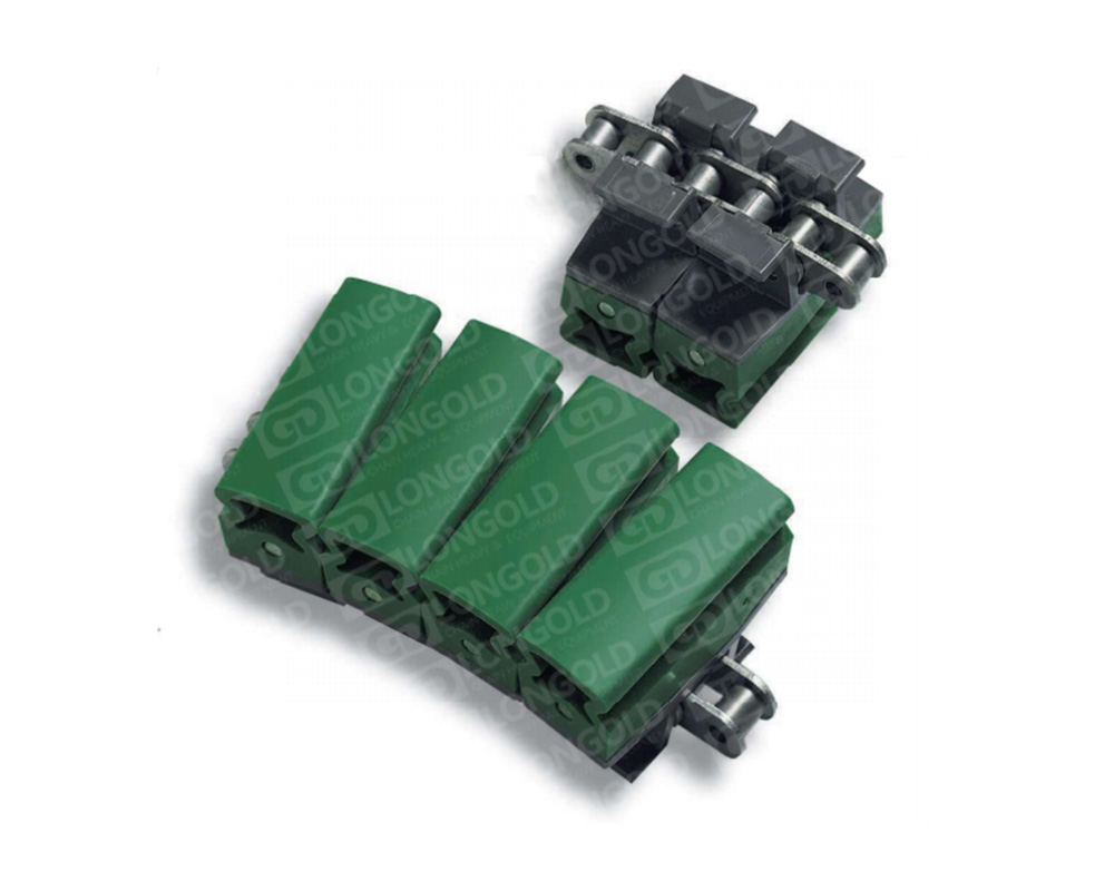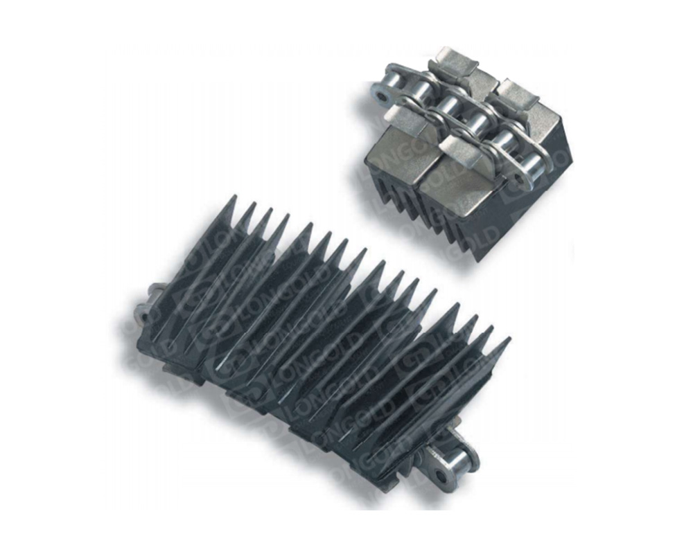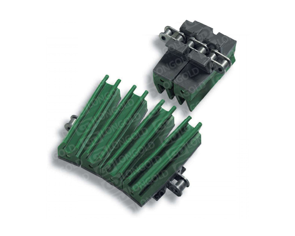 GC1873T系列鏈條為勾腳型雙體夾瓶鏈。鏈片為塑料材質(zhì),鏈片上有“屋”型橡膠