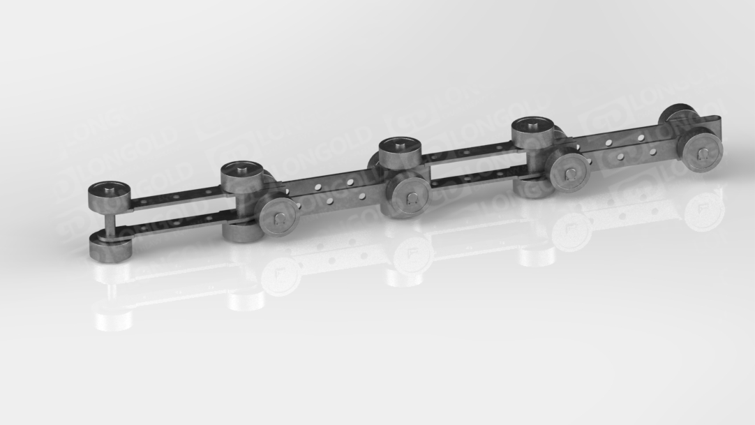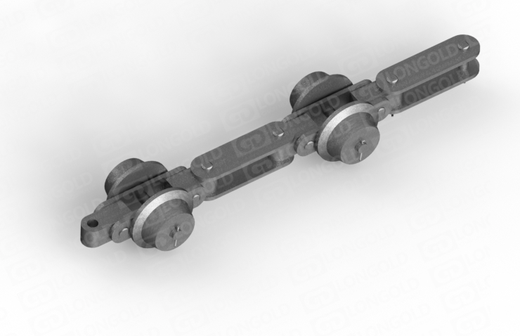 雙鉸接輸送鏈條設計用于能夠在空間范圍內沿彎曲封閉軌道平穩(wěn)運行的輸送系統(tǒng),常見于輕型封閉軌懸掛輸送機。它的結構允許在多個方向上靈活移動,適用于復雜的輸送路線。