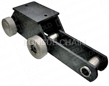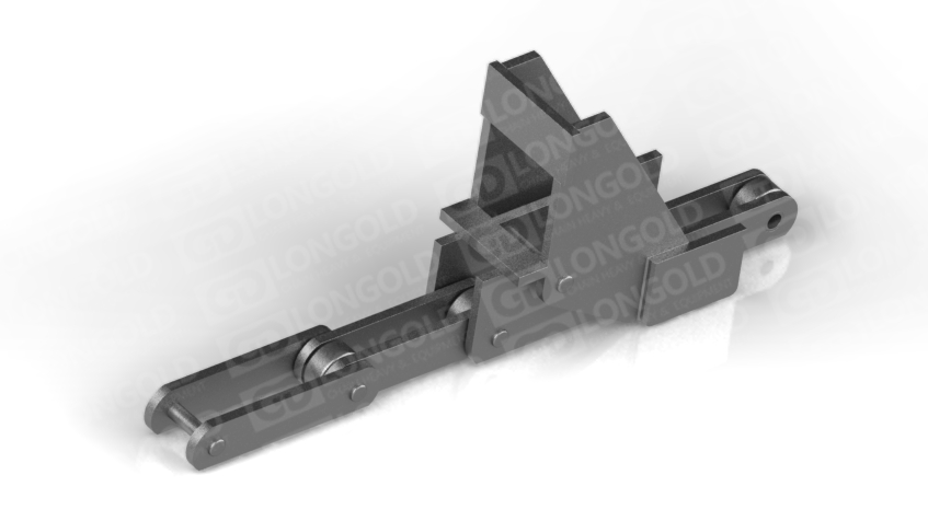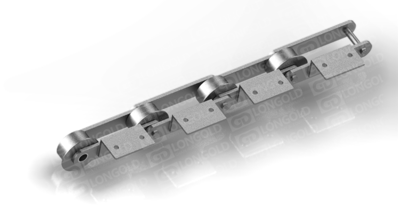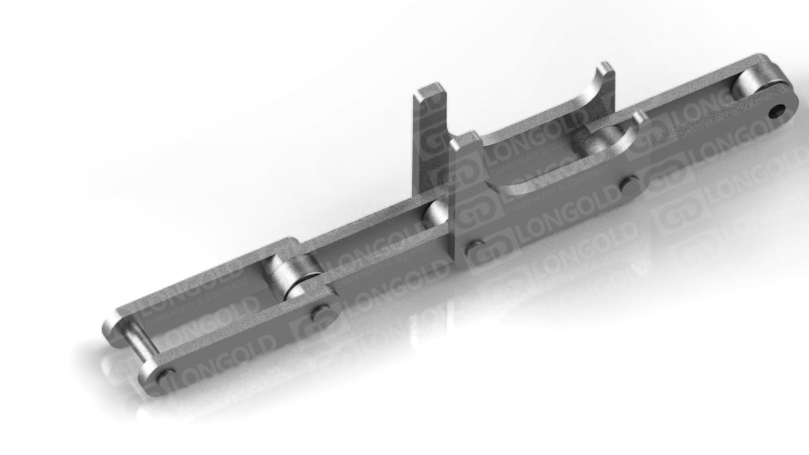 一側(cè)的鏈板帶焊接直立附板,鏈條依靠附板形成的固定槽來(lái)固定所運(yùn)輸物料,同時(shí),可通過(guò)附板上的安裝孔安裝所需的部件來(lái)滿足鏈條工作的需求。