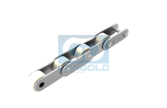 本體鏈條為雙倍節(jié)距輸送鏈,鏈條滾子為工程塑料制R滾子。本體鏈條可為普通規(guī)格,鍍鎳規(guī)格和SS不銹鋼規(guī)格。