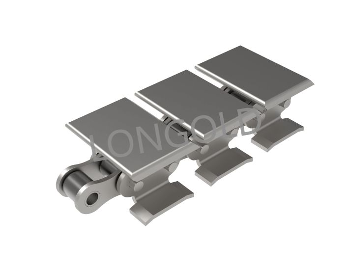 鏈條的內(nèi)外鏈板間與銷軸套筒間的間隙比標準滾子鏈大,使得鏈條增加了橫向彎曲與扭曲性能的滾子鏈條,我們稱這種鏈條為側(cè)彎鏈條。在側(cè)彎鏈條上加裝附件,可以滿足不同的應(yīng)用場合。