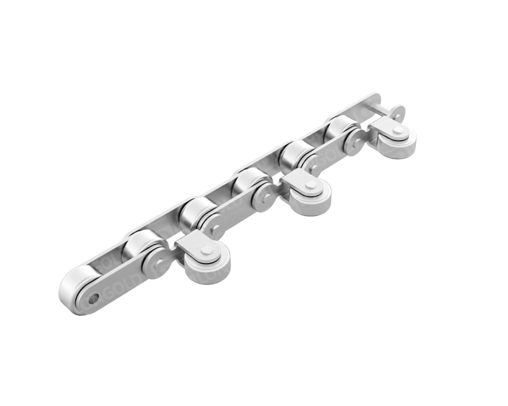 與頂置滾子鏈相比,不銹鋼中心滾子鏈重心較低,兩側(cè)滾子同時受力,因此可實現(xiàn)穩(wěn)定輸送。采用兩側(cè)標準滾子鏈,中間每隔兩節(jié)裝配一個大滾輪結(jié)構(gòu),用于輕型物料的輸送