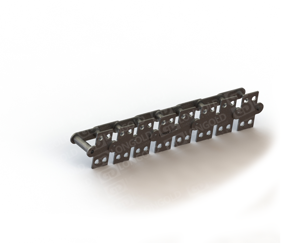 與短節(jié)距A系列滾?鏈條相?,鏈條節(jié)距增加1倍(稱為雙倍節(jié)距),鏈板形狀為直板形,鏈條的兩側(cè)帶有直立板附件,且附件上有兩個螺孔的形式。依照JIS,ISO和ASME標準。