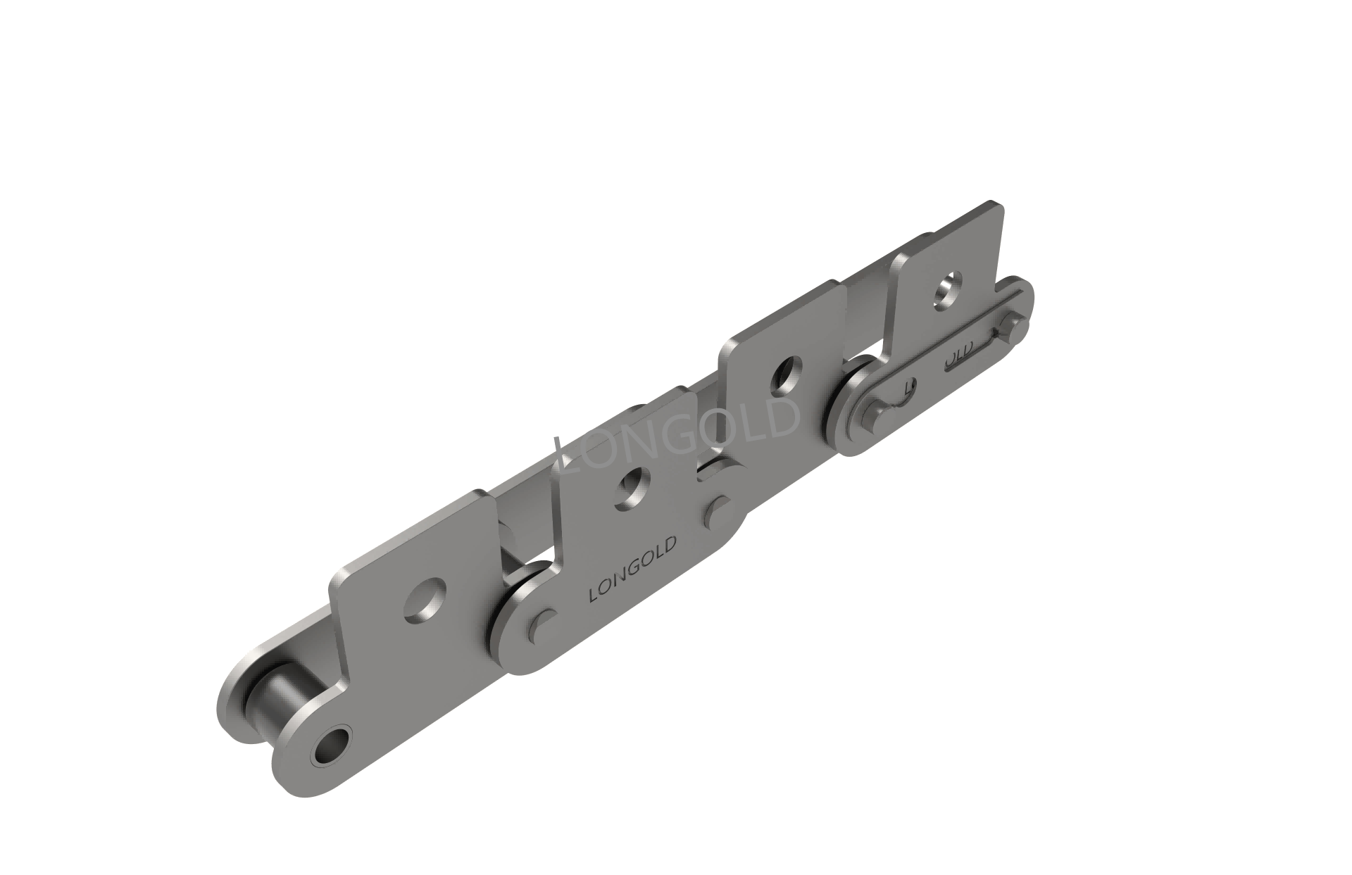 與短節(jié)距A系列滾?鏈條相?,鏈條節(jié)距增加1倍(稱為雙倍節(jié)距),鏈板形狀為直板形,鏈條的兩側(cè)帶有彎板附件,且附件上有一個(gè)螺孔的形式。依照J(rèn)IS,ISO和ASME標(biāo)準(zhǔn)。