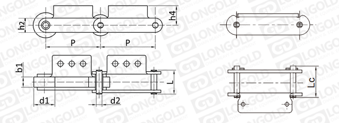 此種輸送鏈是由雙節(jié)距鏈條衍生而來的,鏈條節(jié)距為非常用規(guī)格,通過裝備標準附件或非標附件使鏈條滿足特定的工作需求。