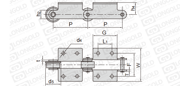 此種輸送鏈是由雙節(jié)距鏈條衍生而來的,鏈條節(jié)距為非常用規(guī)格,通過裝備標準附件或非標附件使鏈條滿足特定的工作需求。