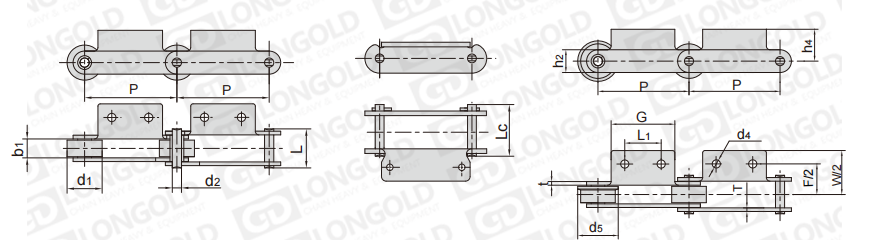 此種輸送鏈?zhǔn)怯呻p節(jié)距鏈條衍生而來的,鏈條節(jié)距為非常用規(guī)格,通過裝備標(biāo)準(zhǔn)附件或非標(biāo)附件使鏈條滿足特定的工作需求。