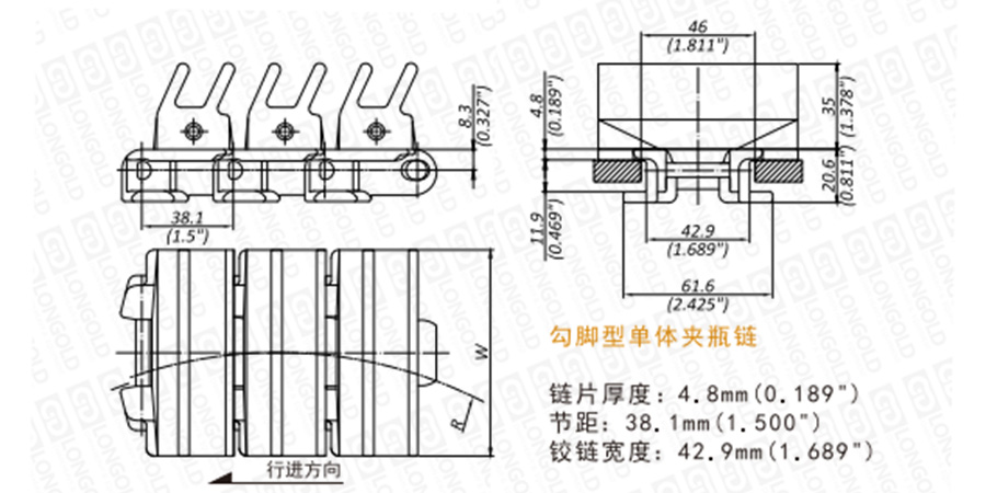 上圖為L(zhǎng)DGU878T系列 一體式夾瓶鏈的結(jié)構(gòu)圖,圖紙已標(biāo)明本體尺寸。