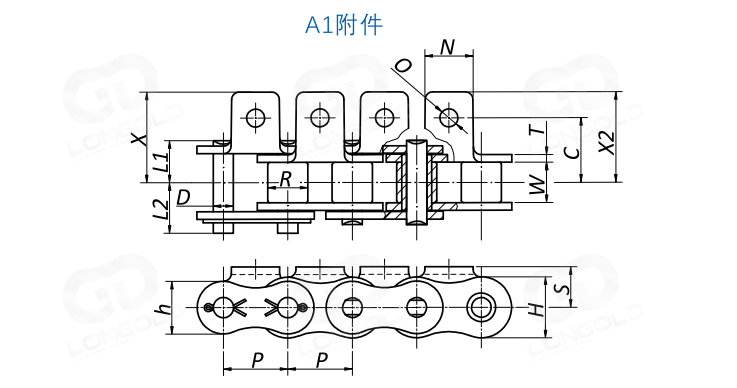 ANSI標(biāo)準(zhǔn)滾子鏈條,單側(cè)帶折彎板附件,附板上帶1個(gè)孔,且孔的直徑為特制的。