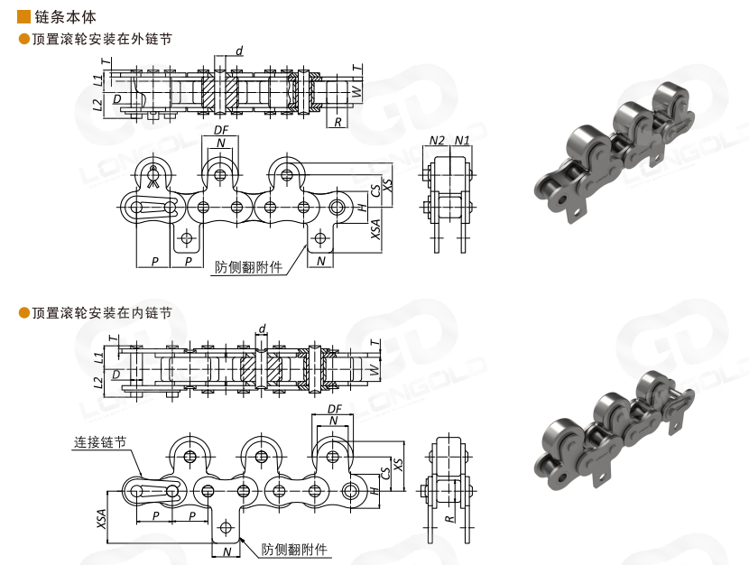 2. 頂置滾子安裝在外鏈節(jié)時(shí),防翻倒附件安裝在內(nèi)鏈節(jié)上;頂置滾子安裝在內(nèi)鏈節(jié)時(shí),防翻倒附件安裝在外鏈節(jié)上。