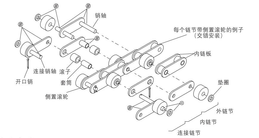 圖示為按交錯型每一個鏈節(jié)安裝側(cè)置滾輪例。 交錯型每個鏈節(jié)帶側(cè)置滾子時,安裝塑料制動滾輪,以每三個鏈節(jié)(圖例中畫斜線的側(cè)置滾子對應的鏈節(jié))為標準。