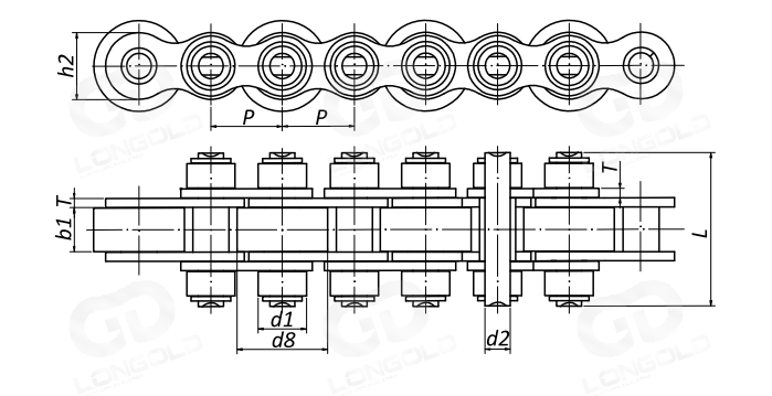 與中心滾子鏈相比,在短節(jié)距傳動鏈條和雙節(jié)距傳動鏈條的基礎(chǔ)上加大鏈條滾子直徑,且兩側(cè)的銷軸可以延長,在延長部分加裝側(cè)置滾輪使用。