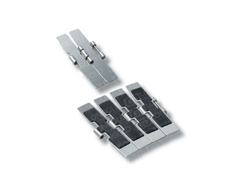 帶橡膠墊的金屬頂板鏈條設(shè)計用于減少噪音和振動,同時提供額外的牽引力和緩沖,以保護輸送的物品免受損傷。橡膠墊通常與鏈板頂部結(jié)合,以增強鏈條在運行過程中的性能和耐用性。