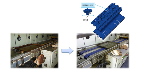 應(yīng)用前,因托盤的油份或底面的凹凸,托盤易在頂板鏈上滑動(dòng),導(dǎo)致輸送頻繁停止。 使用鏈條內(nèi)部嵌入磁鐵的塑料頂板鏈條后,磁鐵的磁力吸住托盤,使托盤不再滑動(dòng)。 |